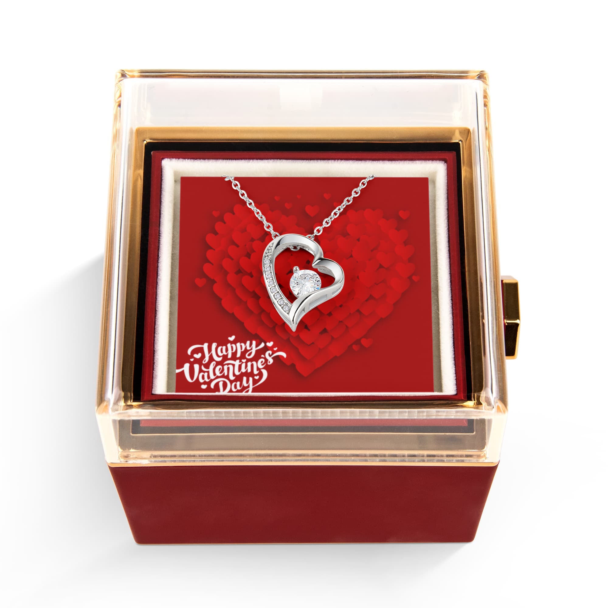 Imagine her reaction as she receives this beautiful Forever Love Necklace. The luxurious box, featuring a charming preserved rose that never fades, adds an extra touch of love. With a simple turn of the gold knob, her breathtaking gift is revealed—making it the perfect sentimental gift for that special someone.